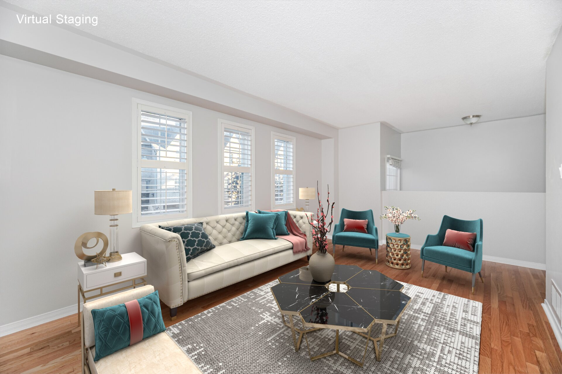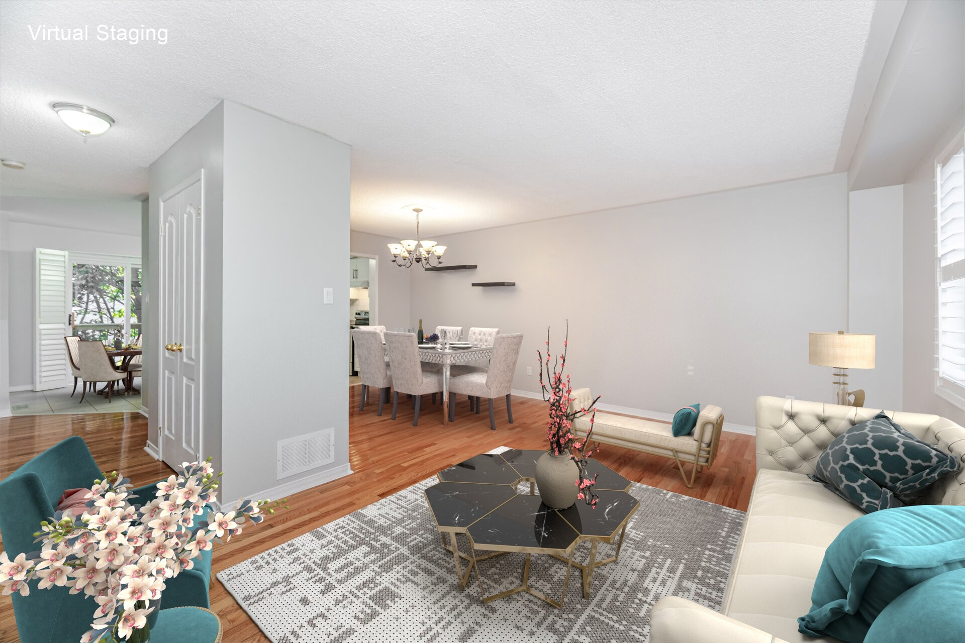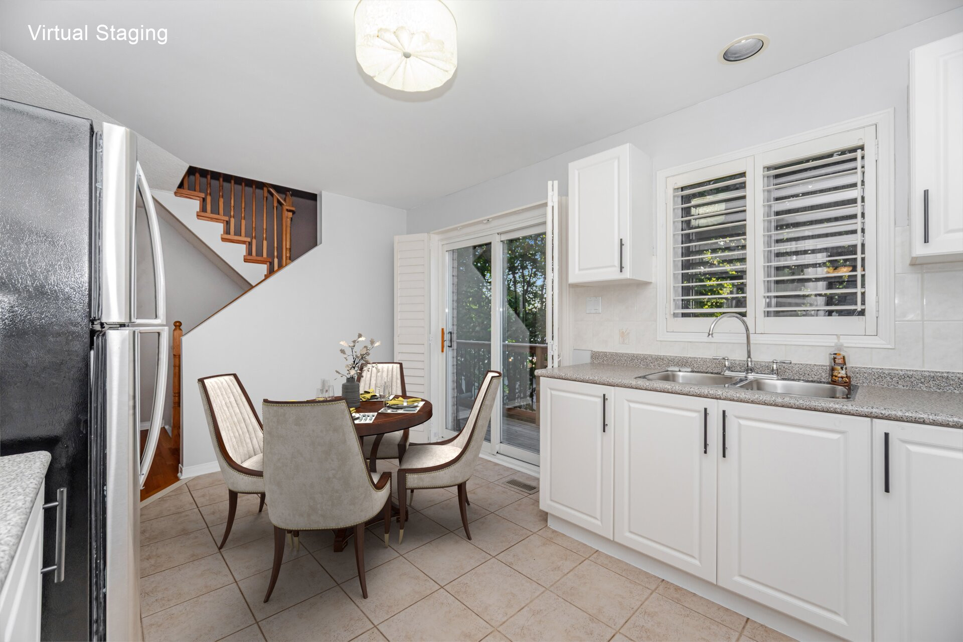Nestled in the exclusive Harvest Landing enclave of just 24 townhomes, this rare 2 Bedroom, 3-bathroom executive townhome is a private oasis backing onto the lush ravine of South Fletcher's Creek. The bright, open-concept main floor includes a spacious living and dining area with a walk-out to the private deck, perfect for soaking in the beautiful ravine views. Main floor offers open concept living area with hardwood floors and large kitchen.